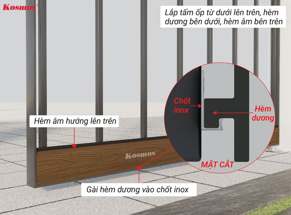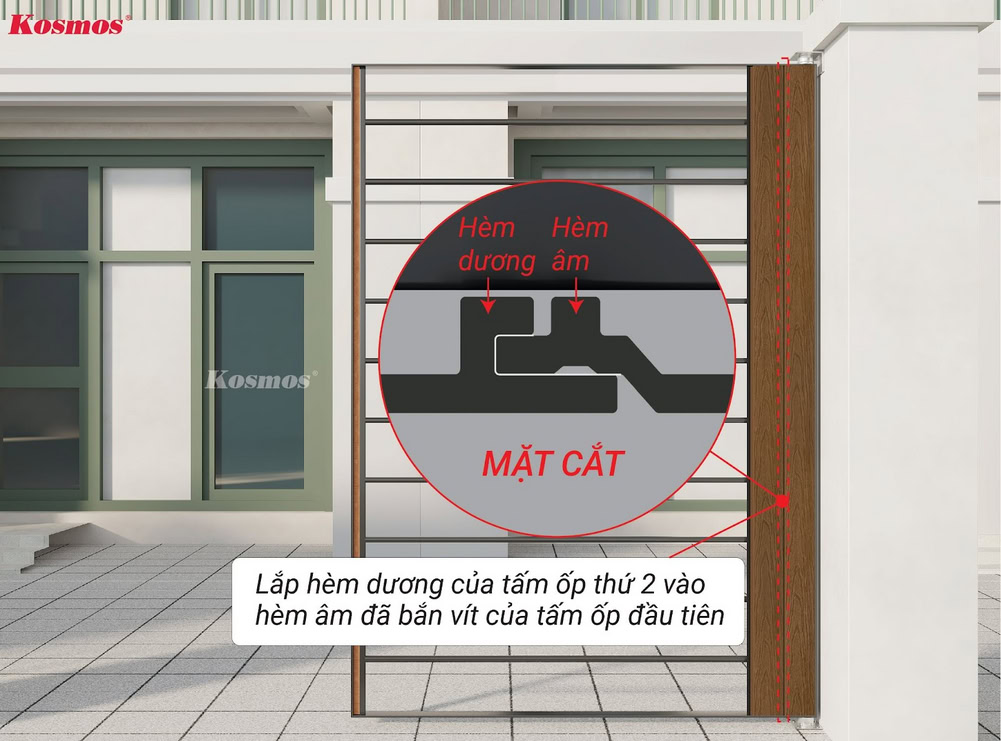 - OP156 khi ốp cổng ngang cần được thi công từ dưới lên trên, hèm dương hướng xuống dưới, hèm âm hướng lên trên.