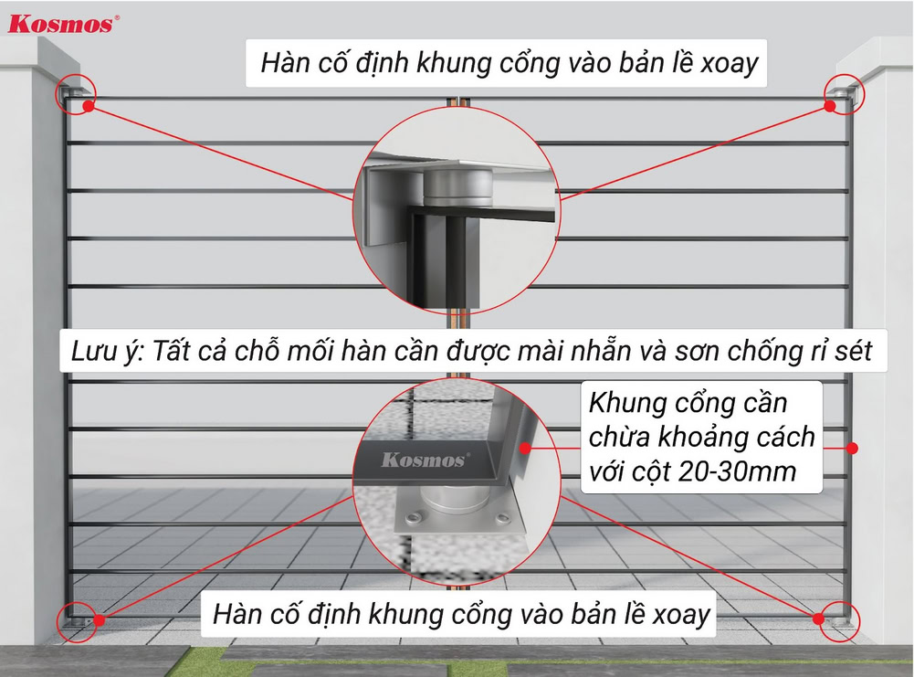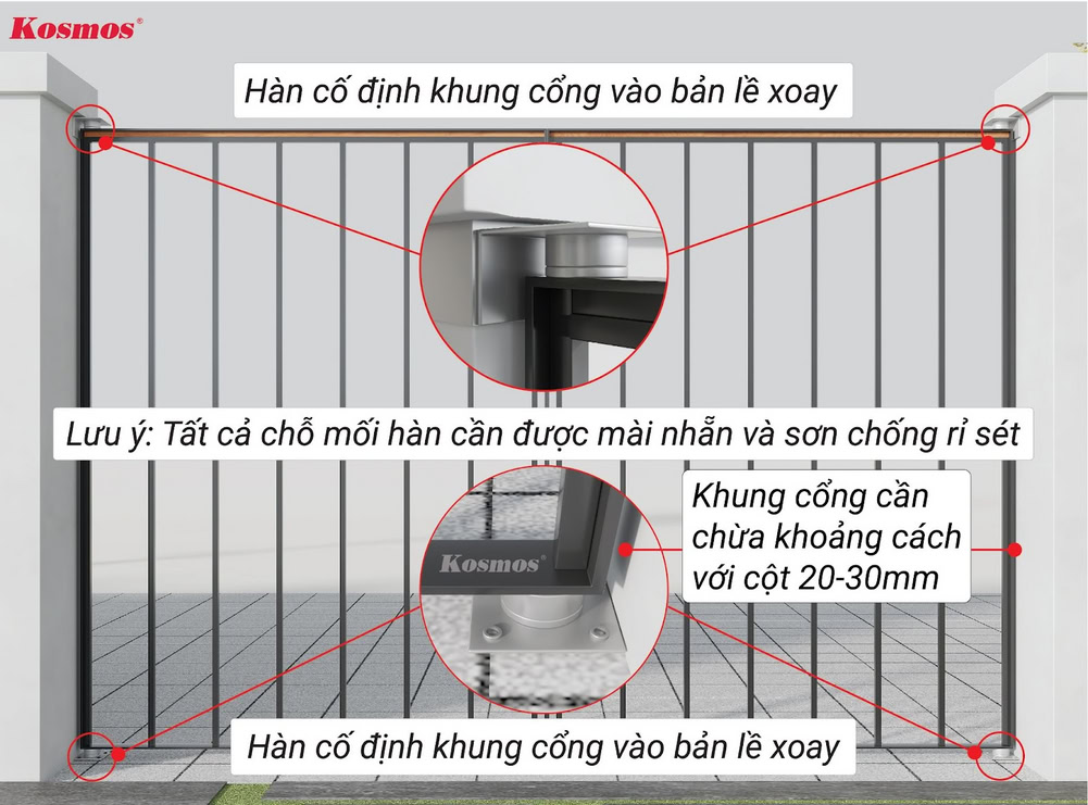 Tiếp tục, hàn cố định khung xương cổng vào bản lề xoay như hình bên dưới. Khung cổng cần chừa khoảng cách với cột từ 2 – 3cm.