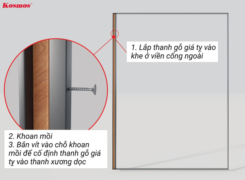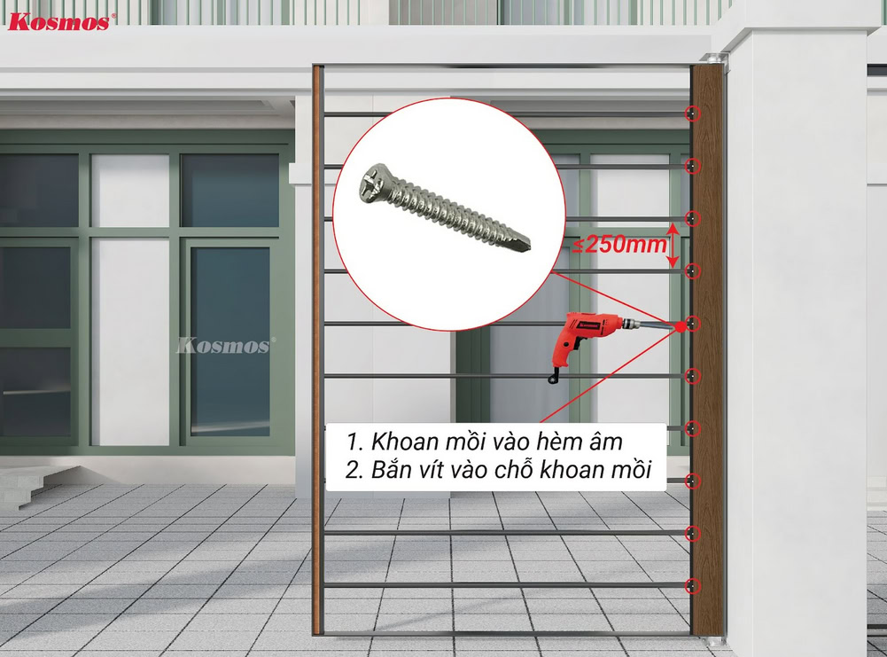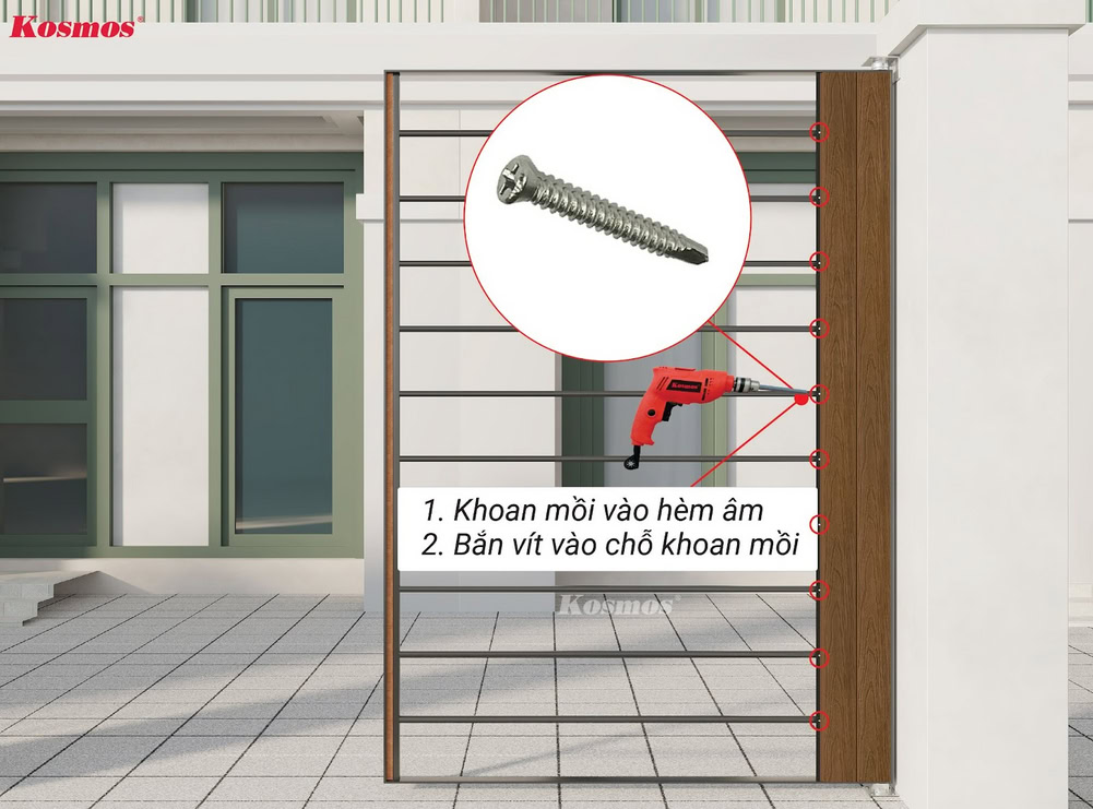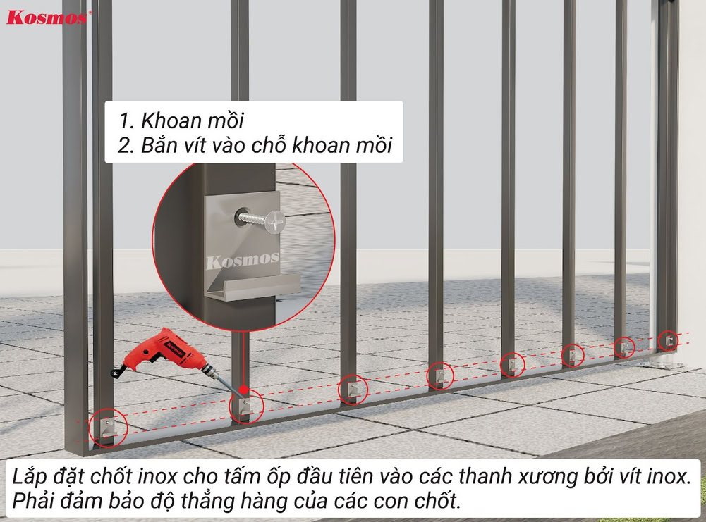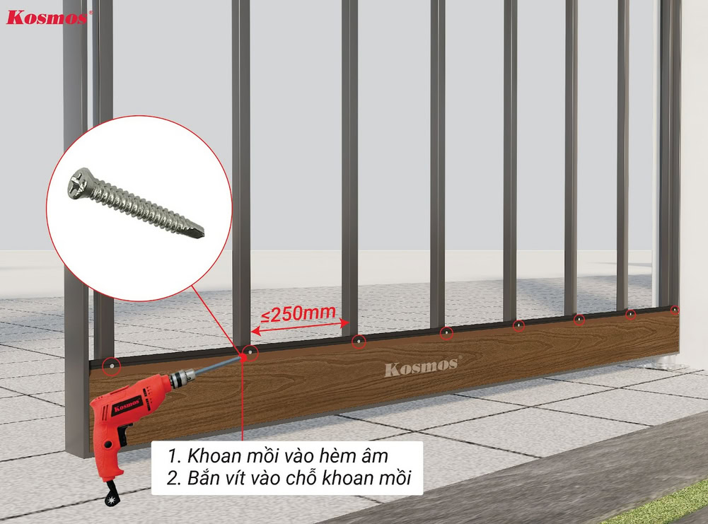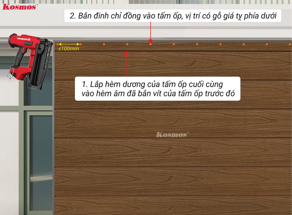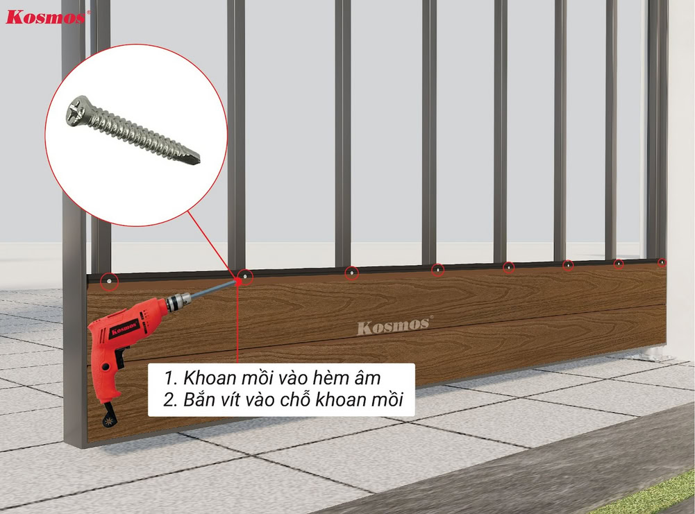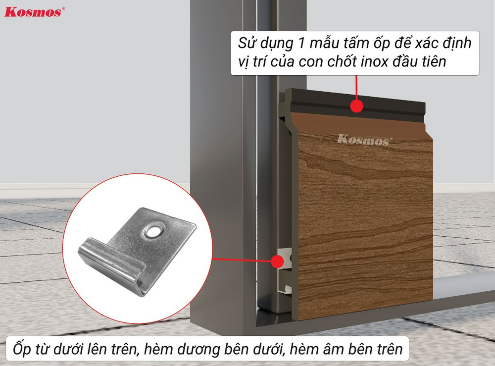 ** Kosmos khuyến cáo: Cần khoan mồi trước khi bắn vít vào hèm âm của tấm ốp gỗ nhựa 2 lớp phủ Polymer OP156.