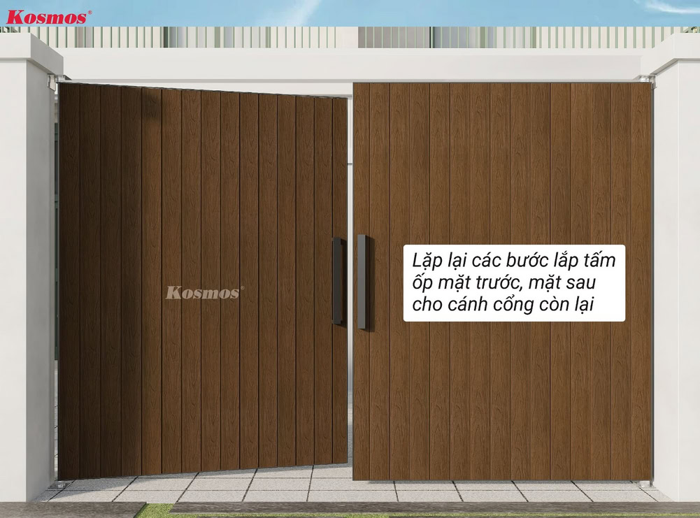 Bước 6: Lắp đặt tấm ốp gỗ nhựa 2 lớp OP156 lên khung xương cổng (Mặt sau cổng)