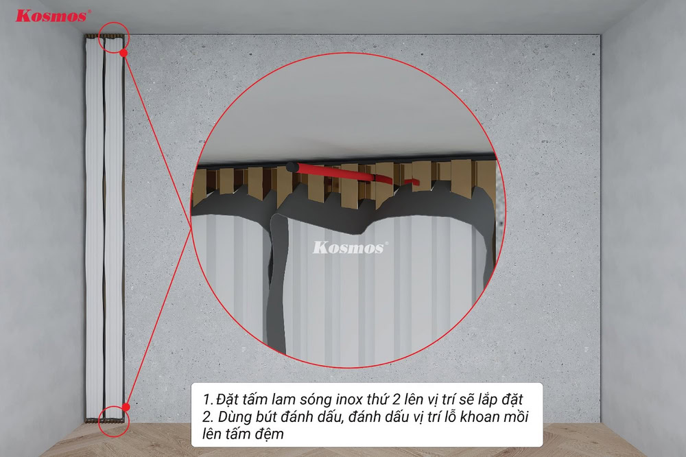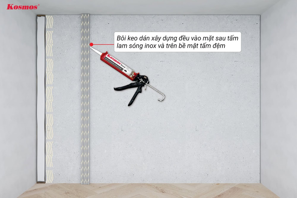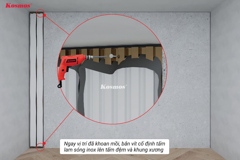 Lưu ý: Phải có thanh xương ở vị trí cuối cùng hai đầu trên và dưới tấm ốp lam sóng inox. Đây là điểm cố định tấm lên khung xương bằng vít inox. Sau khi dựng khung xương, người thợ cố định tấm đệm (tấm foam nhựa hoặc tấm xi măng) bằng vít inox đầu bằng đuôi tè lên khung xương. Việc sử dụng tấm đệm để tạo bề mặt phẳng trước khi dán tấm inox. Lưu ý: Bắt buộc sử dụng vít đầu bằng đuôi tè để cố định tấm đệm lên khung xương. Người thợ đo kích thước khu vực cần lắp, sau đó cắt tấm theo kích thước thực tế. Lưu ý: Trong quá trình cắt và lắp đặt, thợ nên đeo găng tay bảo hộ vì cạnh tấm inox khá bén, nếu cầm trực tiếp rất dễ bị đứt tay. Ta khoan mồi lên sóng âm tấm ốp lam sóng inox, bên trên 1 lỗ, bên dưới 1 lỗ. Ta phải xé lớp màng bảo vệ bề mặt quanh mép để dễ thi công và gỡ ra sau đó. Ta đặt tấm lam sóng đã khoan mồi lên vị trí cần lắp, dùng bút đánh dấu vào lỗ khoan trên tấm đệm, vị trí có thanh xương. Khoan lỗ lên thanh xương tại vị trí đã đánh dấu. Ngay vị trí đã khoan mồi, ta bắn vít cố định tấm lam sóng inox lên khung xương. Lắp tấm inox kế tiếp, đặt hèm dương nằm cạnh hèm âm. Thực hiện đủ các bước: khoan mồi tấm, đánh dấu lỗ khoan trên tấm đệm, khoan mồi thanh xương, bôi keo, cố định tấm bằng vít inox. Khi tấm đã được cố định xong, thợ tiến hành tháo lớp màng bảo vệ trên bề mặt inox. Lưu ý: Không nên tháo lớp màng bảo vệ trong quá trình lắp đặt để tránh làm trầy xước bề mặt tấm. Cuối cùng, người thợ dán nẹp V inox ở các cạnh kết thúc để che mép tấm, giúp mảng ốp hoàn thiện và đẹp hơn. Thi công lam sóng inox lên khung xương là phương pháp giúp bề mặt ốp thẳng và chắc chắn hơn, đặc biệt phù hợp với tường không phẳng hoặc tường ẩm. Nếu tường đã đạt yêu cầu, Quý khách có thể tham khảo cách lắp tấm inox trực tiếp lên tường. Bộ phận tư vấn khách hành Kosmos sẵn sàng giải đáp thắc mắc thêm qua số 0932.067.388