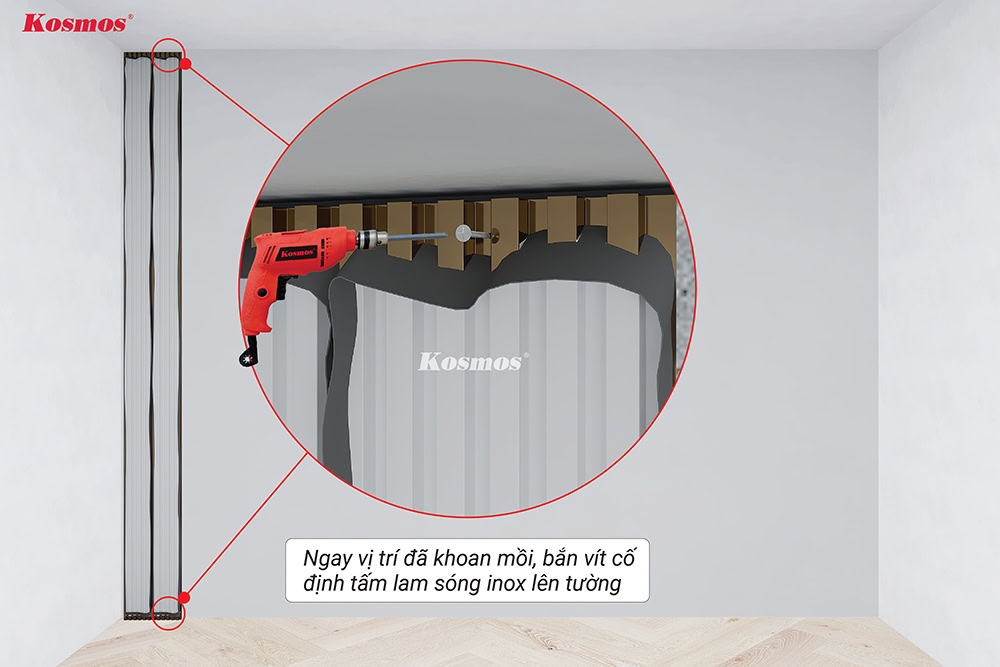 Ngay vị trí đã khoan mồi, ta bắn vít cố định tấm lam sóng inox lên tường.