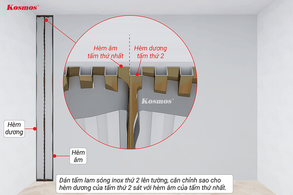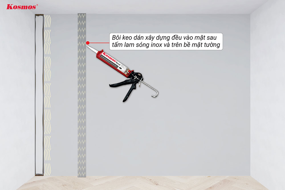 Phương pháp dán lam sóng inox trực tiếp lên tường là cách thi công nhanh và tiết kiệm chi phí, nhưng chỉ phù hợp khi tường phẳng, khô và chắc chắn. Quý khách có thể tham khảo hướng dẫn thi công tấm ốp lam sóng trên khung xương khi tường không đạt yêu cầu. Kosmos sẵn sàng tư vấn thêm qua số 0932.067.388