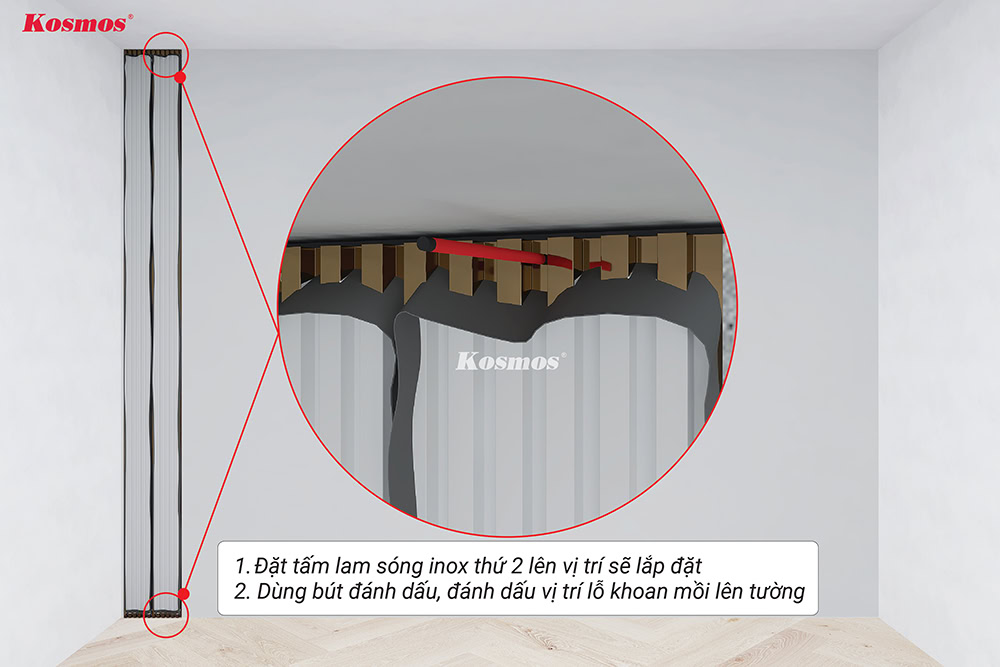 Lắp tấm inox kế tiếp, đặt hèm dương nằm cạnh hèm âm. Thực hiện đủ các bước: khoan mồi tấm, đánh dấu lỗ khoan trên tường, khoan mồi tường, bôi keo, cố định tấm bằng vít inox.