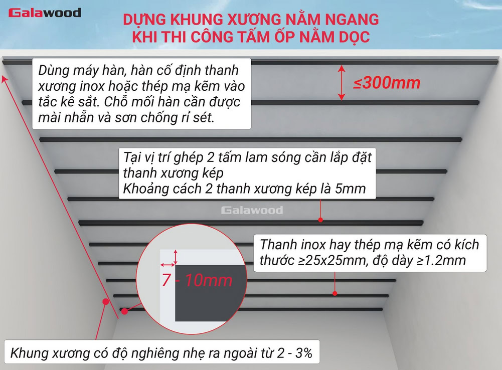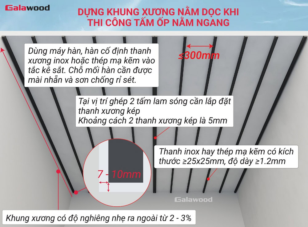 - Thi công đúng chiều: Thanh xương phải được lắp vuông góc với chiều ốp tấm. Cụ thể, ốp tấm dọc → lắp xương ngang, ốp tấm ngang → lắp xương dọc.