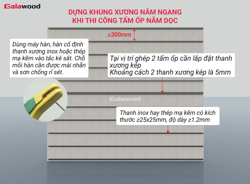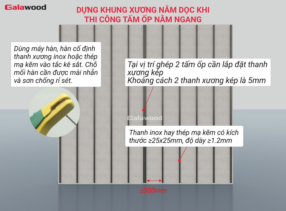 - Thi công đúng chiều: Thanh xương phải được lắp vuông góc với chiều ốp tấm. Cụ thể, ốp tấm dọc → lắp xương ngang, ốp tấm ngang → lắp xương dọc.
