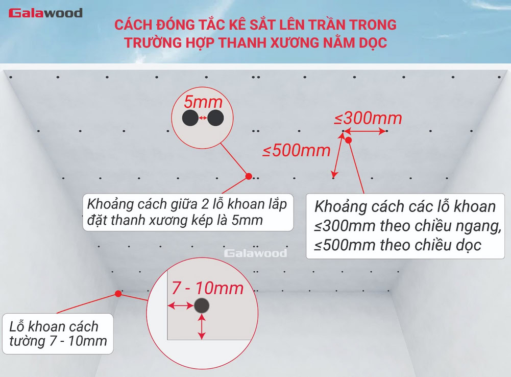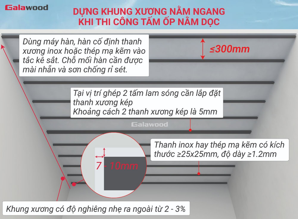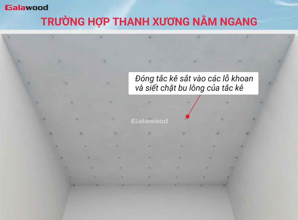 - Thi công đúng chiều: Thanh xương phải được lắp vuông góc với chiều ốp tấm. Cụ thể, ốp tấm dọc → lắp xương ngang, ốp tấm ngang → lắp xương dọc.