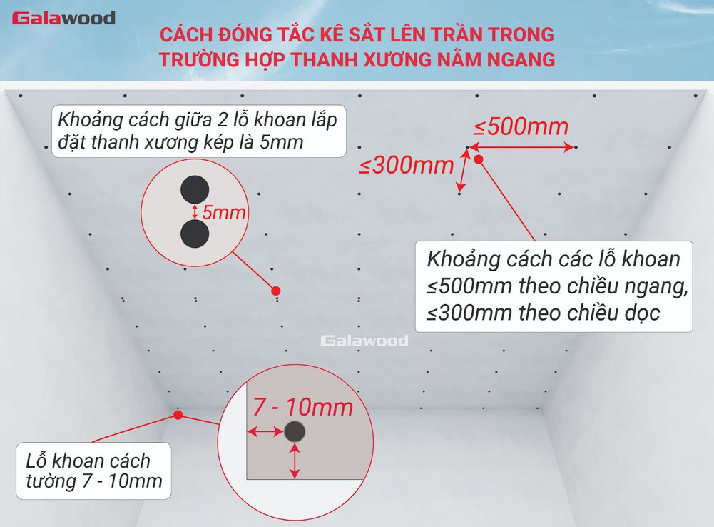 Lưu ý: Vị trí lắp đặt thanh xương kép (khoảng cách giữa 2 thanh xương 5mm), yêu cầu khoảng cách giữa 2 tắc kê tương ứng là 5mm.