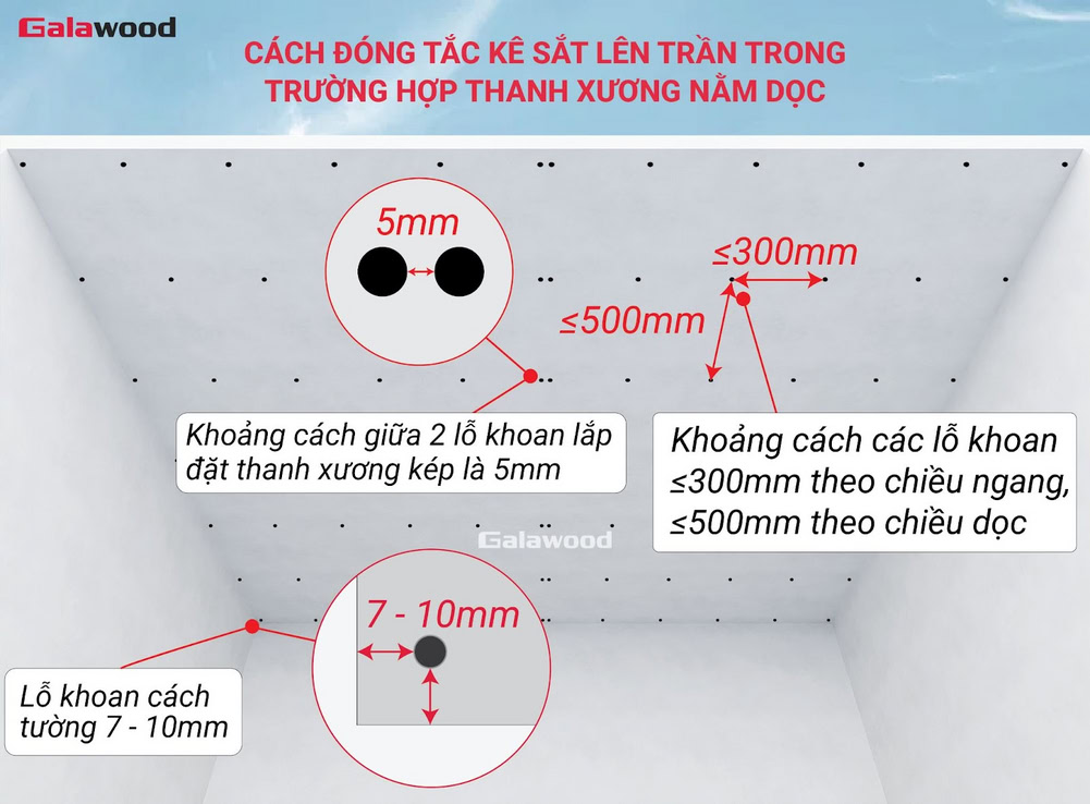 Lưu ý: Vị trí lắp đặt thanh xương kép (khoảng cách giữa 2 thanh xương 5mm), yêu cầu khoảng cách giữa 2 tắc kê tương ứng là 5mm.