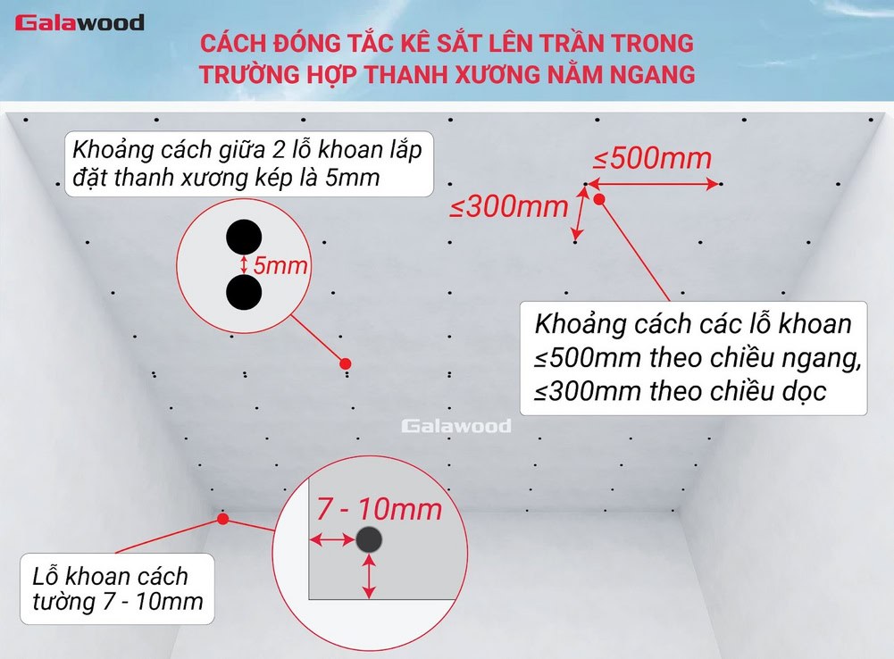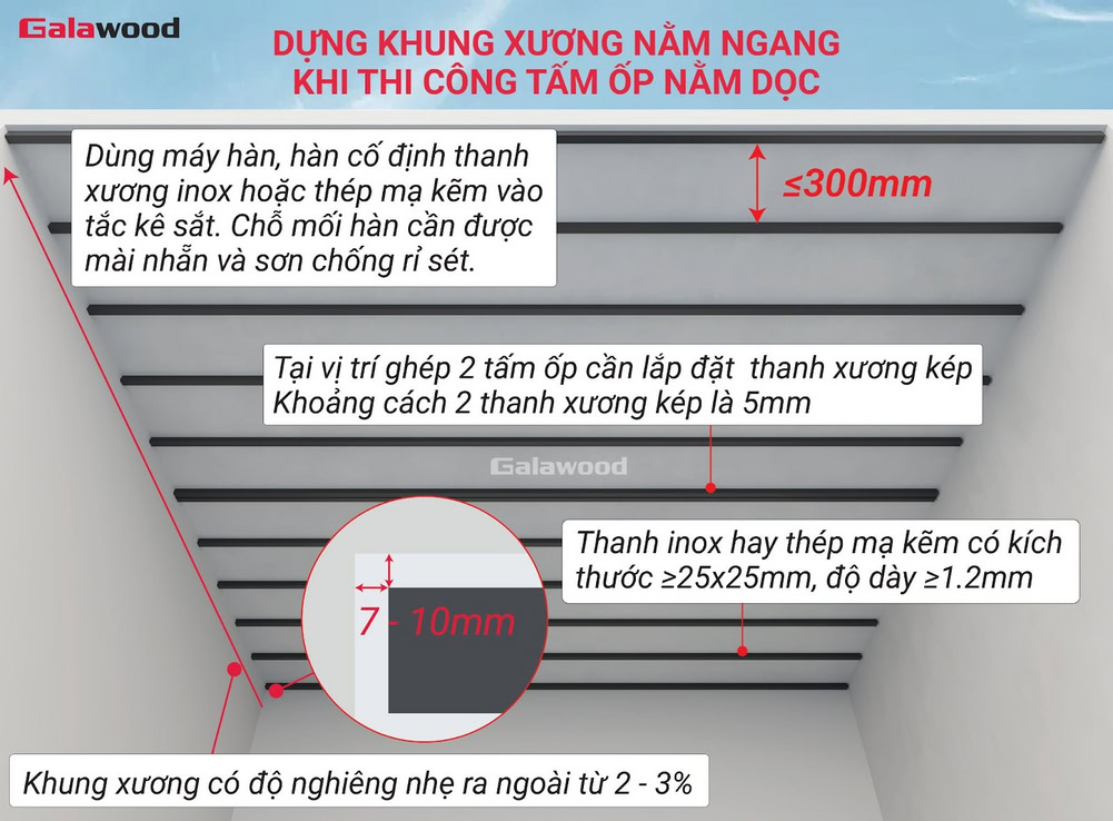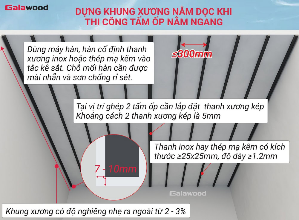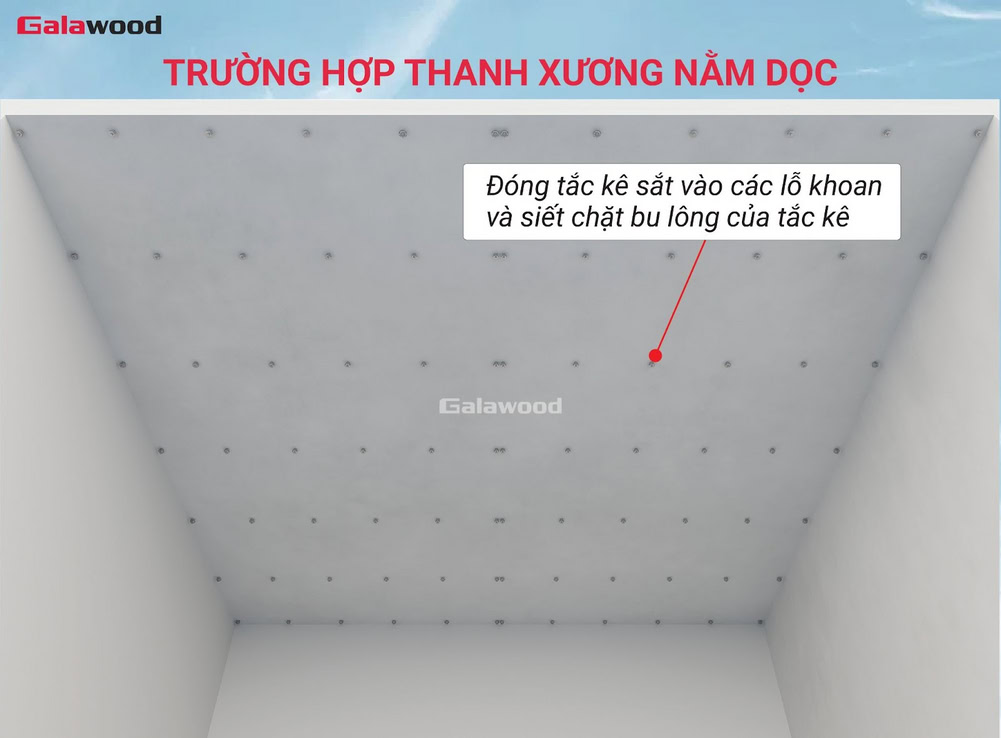 - Thi công đúng chiều: Thanh xương phải được lắp vuông góc với chiều ốp tấm. Cụ thể, ốp tấm dọc → lắp xương ngang, ốp tấm ngang → lắp xương dọc.