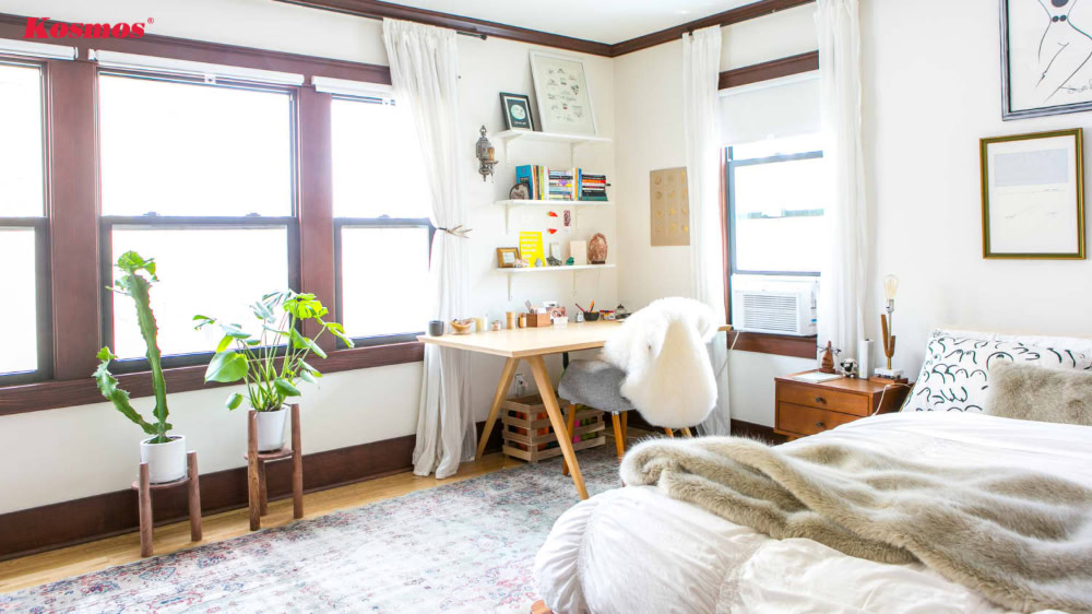 Với nhà nhỏ, kết hợp phòng làm việc và phòng ngủ là giải pháp tiện lợi. Bạn có thể bố trí bàn làm việc liền tủ quần áo hoặc tận dụng bàn trang điểm để dùng chung. Nên giữ màu sắc đồng bộ với nội thất phòng ngủ và phân chia rõ khu vực làm việc, nghỉ ngơi bằng kệ sách hoặc rèm mỏng để không gian gọn và dễ chịu hơn.
