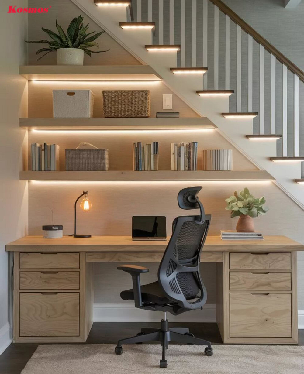 - Nội thất công thái học: Ưu tiên ghế có hỗ trợ lưng và bàn làm việc phù hợp chiều cao, giúp ngồi lâu vẫn thoải mái.