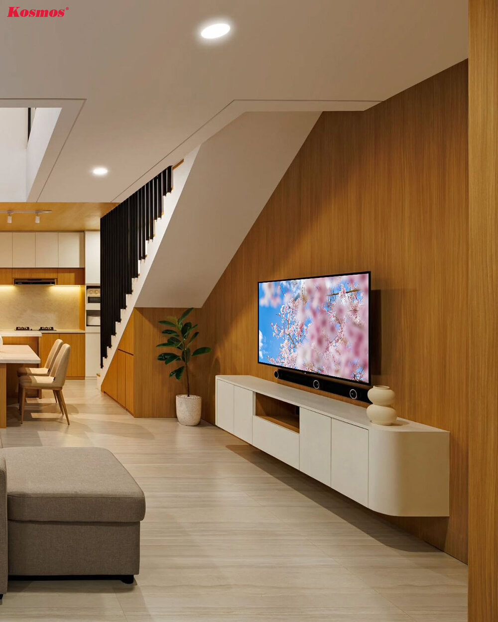 - Thiết kế hợp phong thủy: Trong văn hóa Việt Nam, phong thủy là yếu tố không thể xem nhẹ khi thiết kế nội thất. Cầu thang hướng thẳng ra cửa chính có thể gây thất thoát tài lộc, vì vậy vách tivi cần được bố trí để che chắn và điều hòa luồng khí.