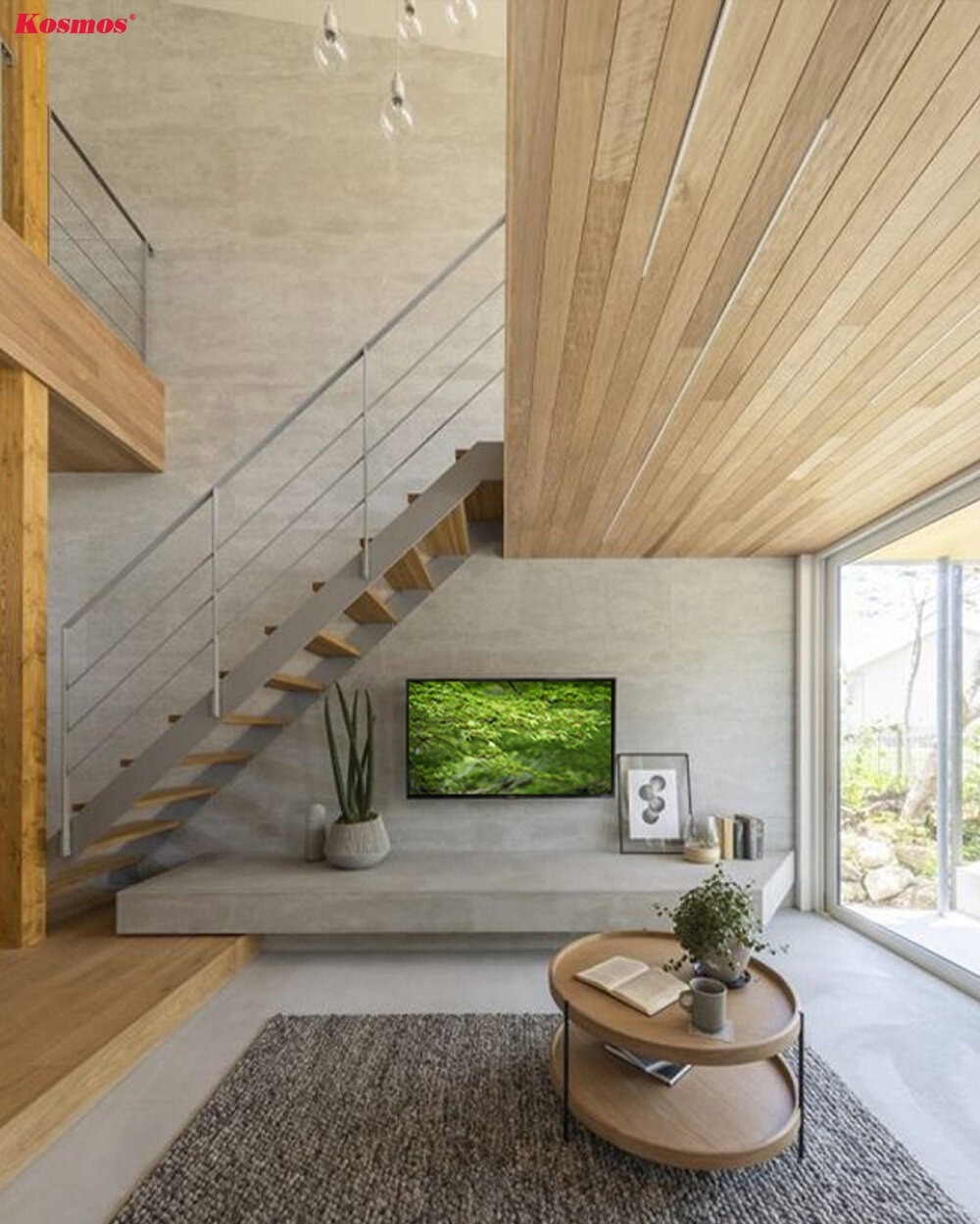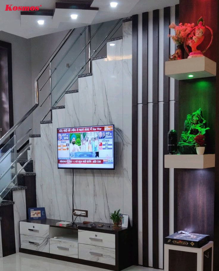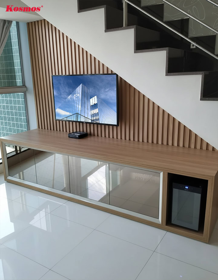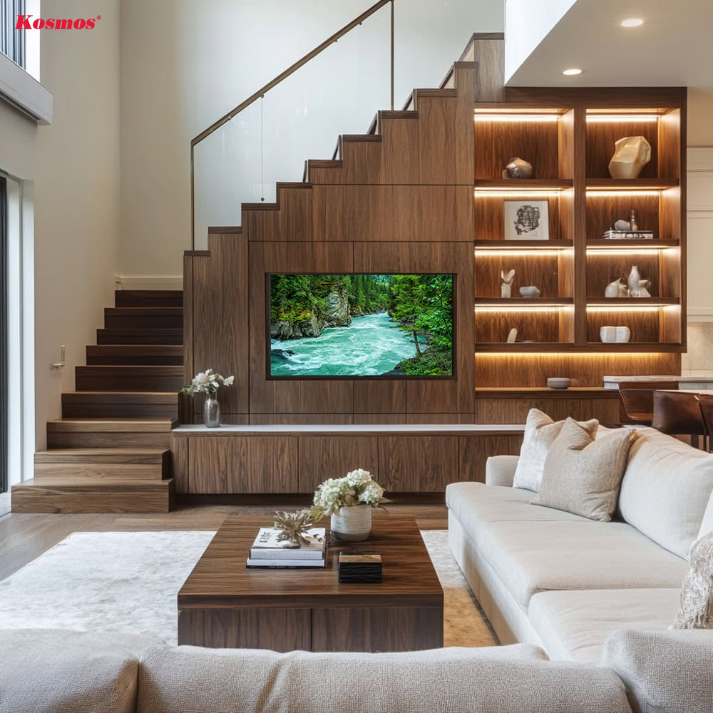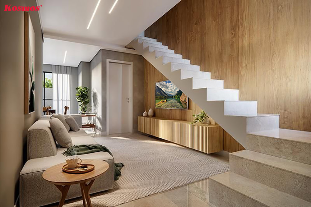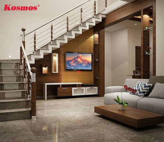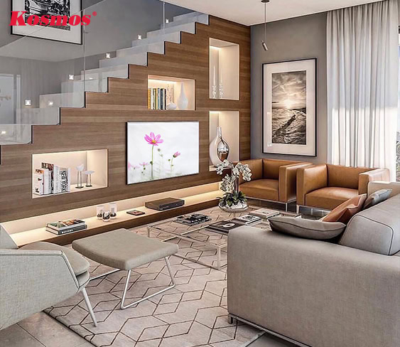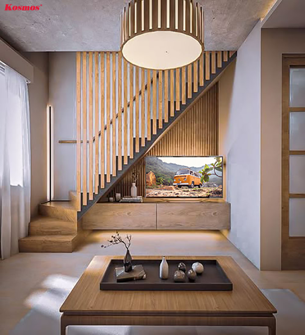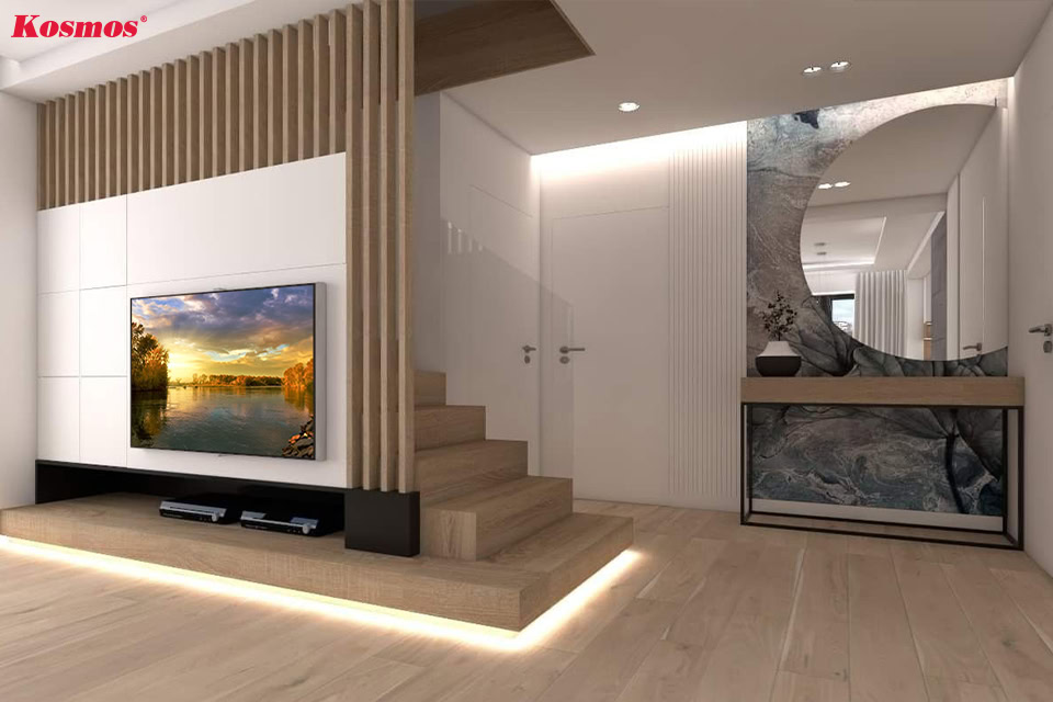 Kosmos Việt Nam tự hào là đơn vị cung cấp vật liệu trang trí nội – ngoại thất cao cấp, bền vững và hiện đại. Chúng tôi hiện phân phối 4 dòng sản phẩm Quý Khách hàng nên tham khảo ứng dụng cho công trình kệ tivi kết hợp vách ngăn cầu thang:
