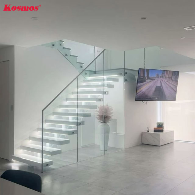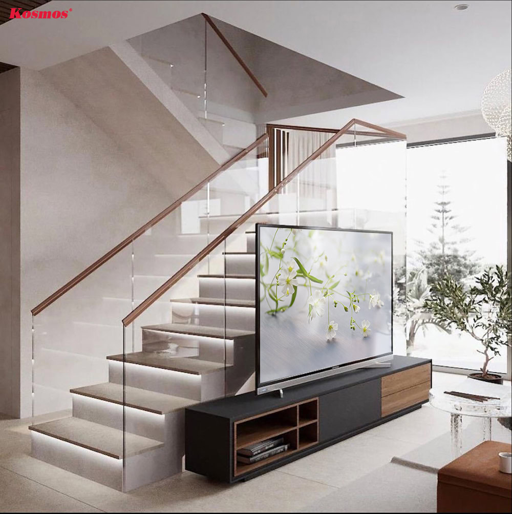 Vách tivi kết hợp vách ngăn cầu thang kính sử dụng kính cường lực cao cấp, mang lại vẻ đẹp hiện đại và cảm giác không gian rộng rãi nhờ đặc tính trong suốt, phản chiếu ánh sáng. Thiết kế này thường được gia công với kính dày 8-12mm, có thể kết hợp các họa tiết khắc hoặc phim dán mờ để tăng tính thẩm mỹ và đảm bảo an toàn.