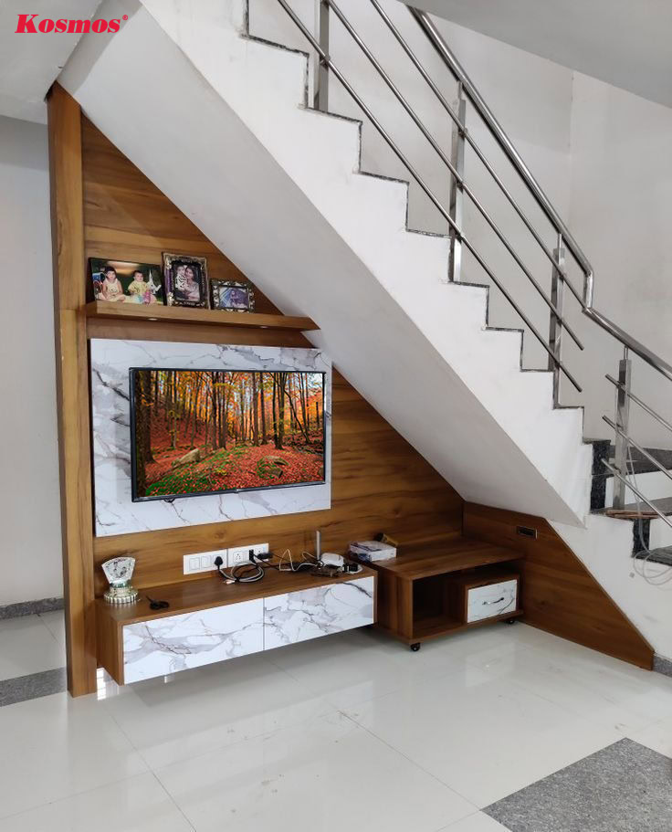 Vách tivi che cầu thang kết hợp tủ trang trí
