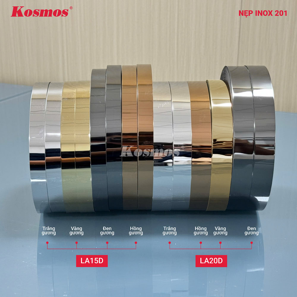 Kosmos cung cấp nhiều mẫu mã và kích thước nẹp inox khác nhau, phục vụ đa dạng nhu cầu từ trang trí, xử lý góc cạnh, đến tạo điểm nhấn cho công trình.