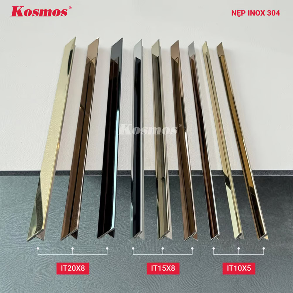 - Inox (thép không gỉ 304): Làm từ inox 304 với thành phần 18% crom và 8% niken, giúp chống gỉ và ăn mòn rất cao, trong cả môi trường ẩm ướt. Đây là loại nẹp duy nhất có thể xử lý vết xước nhẹ bằng cách đánh bóng lại bề mặt. Sản phẩm có bề mặt sáng bóng, dùng cho công trình cao cấp, sang trọng.