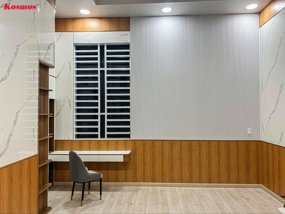 - Chống trầy xước tốt: Lớp phủ bề mặt vật liệu giúp chống trầy xước, nâng cao thẩm mỹ, tuổi thọ công trình ốp lamri.
