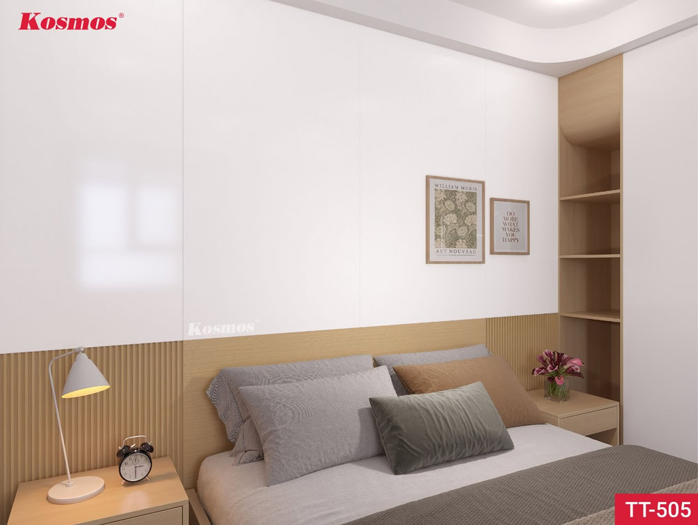 - Ốp vách tivi, vách thông tầng và đầu giường: Mang đến điểm nhấn sang trọng và tinh tế cho không gian sống. Khi kết hợp cùng ánh sáng và nội thất phù hợp, tấm ốp trắng bóng giúp tạo chiều sâu, tăng tính thẩm mỹ cho phòng ngủ, phòng khách, showroom hay khu vực trưng bày sản phẩm.