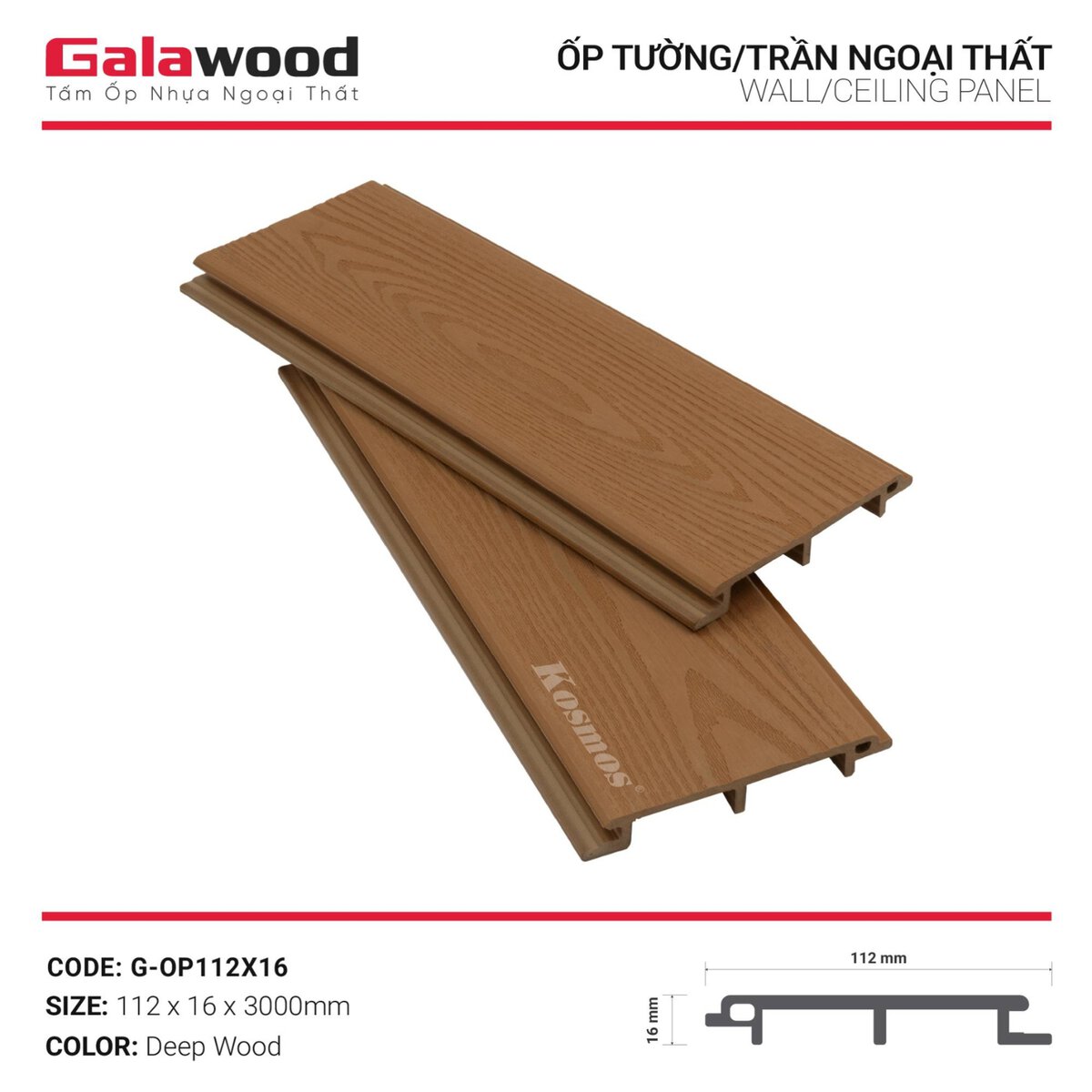 Nếu Quý khách đang tìm kiếm đơn vị uy tín cung cấp vật liệu ốp vách, trần hay mặt dựng ngoài trời chất lượng cao, Kosmos Việt Nam là lựa chọn đáng tin cậy. Kosmos hiện phân phối dòng tấm nhựa giả gỗ phủ ASA Galawood, chuyên ốp tường, trần hiên, cổng, hàng rào hay mặt tiền ngoài trời. Sản phẩm được phủ lớp ASA cao cấp, có tuổi thọ 10 – 15 năm và mức giá chỉ bằng ⅓ – ½ chi phí gỗ tự nhiên nhóm 2.