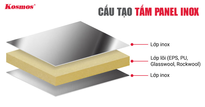 Cấu trúc của tấm Panel bọc Inox bao gồm 3 lớp chính: 2 lớp vỏ ngoài bằng thép không gỉ (inox) và 1 lớp lõi cách nhiệt ở giữa.