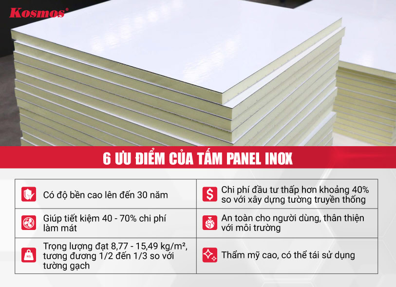 Panel Inox có 6 ưu điểm: Độ bền 30 năm, cách âm – cách nhiệt hiệu quả, thi công nhanh, giá thành thấp hơn 40% so với tường gạch, an toàn sức khỏe và thẩm mỹ cao. Nhờ các ưu điểm này khiến vật liệu thay thế dần phương pháp xây dựng truyền thống.