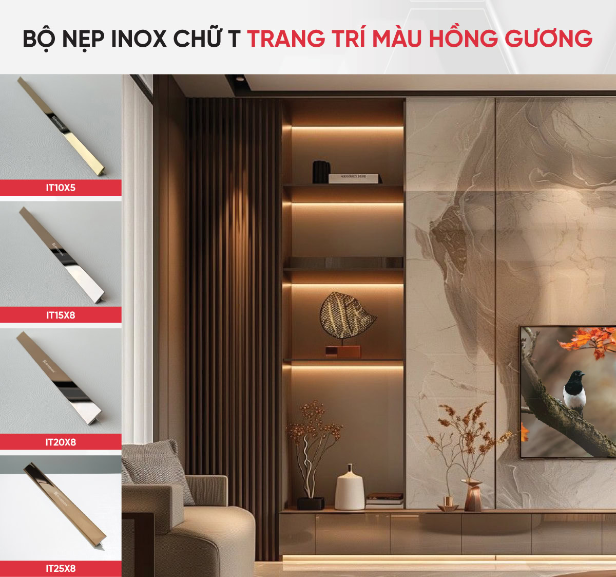 Anplis pwoteksyon bor materyèl yo, taye asye pur yo sèvi tou kòm yon aksan gras a sifas klere li a, souvan kouvri ak PVD pou yon pi bon rezistans koulè ak yon bèl aparans. Koulè tankou lò glas, woz glas, nwa glas, ak blan glas yo souvan itilize pou kreye ti detay pou planche ak revètman wòch wo nivo.