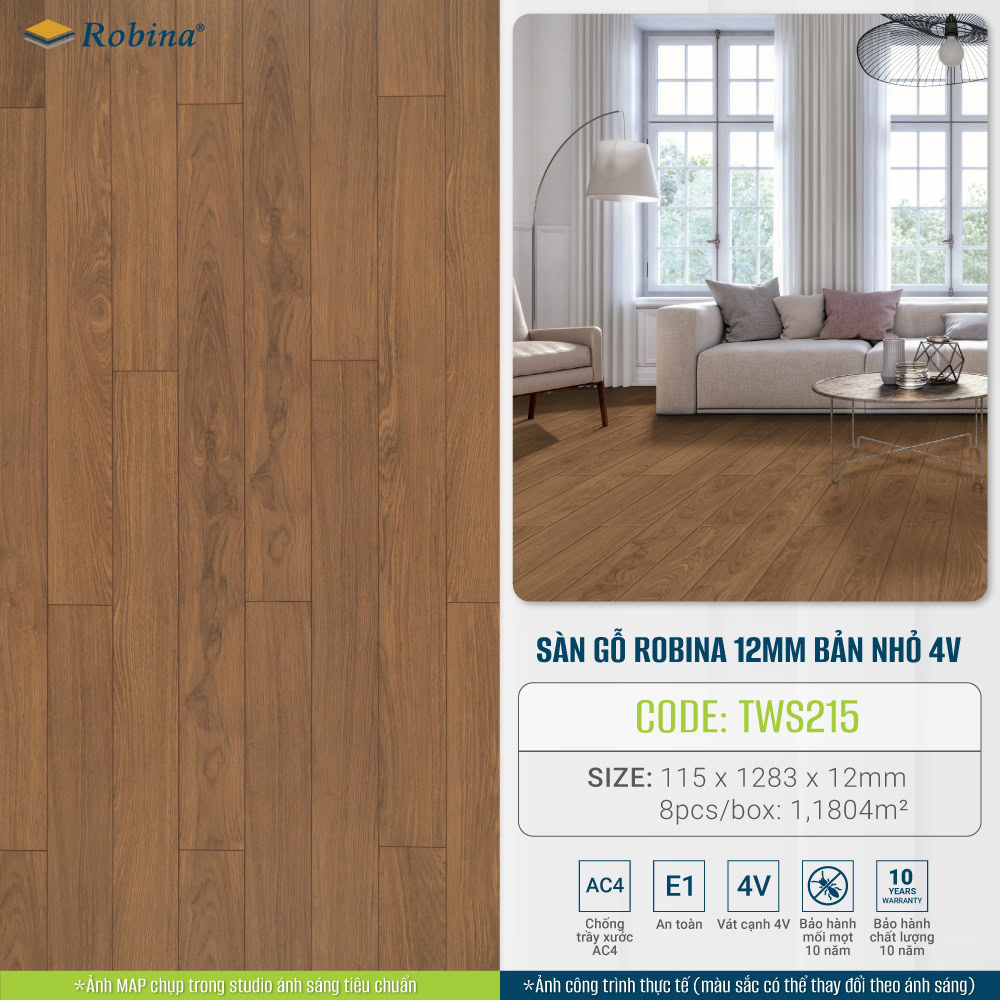 TWS215 gen dimansyon 115 x 12 x 1283mm. Itilizasyon sou planche a Nwayo bwa HDF ki gen gwo dansite (>870kg/m3), ede limite absòpsyon dlo epi anpeche defòmasyon. Kouch sifas AC4 la reziste grafouyen epi li kenbe koulè grenn bwa a pou yon bon bout tan. Koulè mawon fonse Walnut la ede tou kreye pwofondè ak chalè pou espas la.